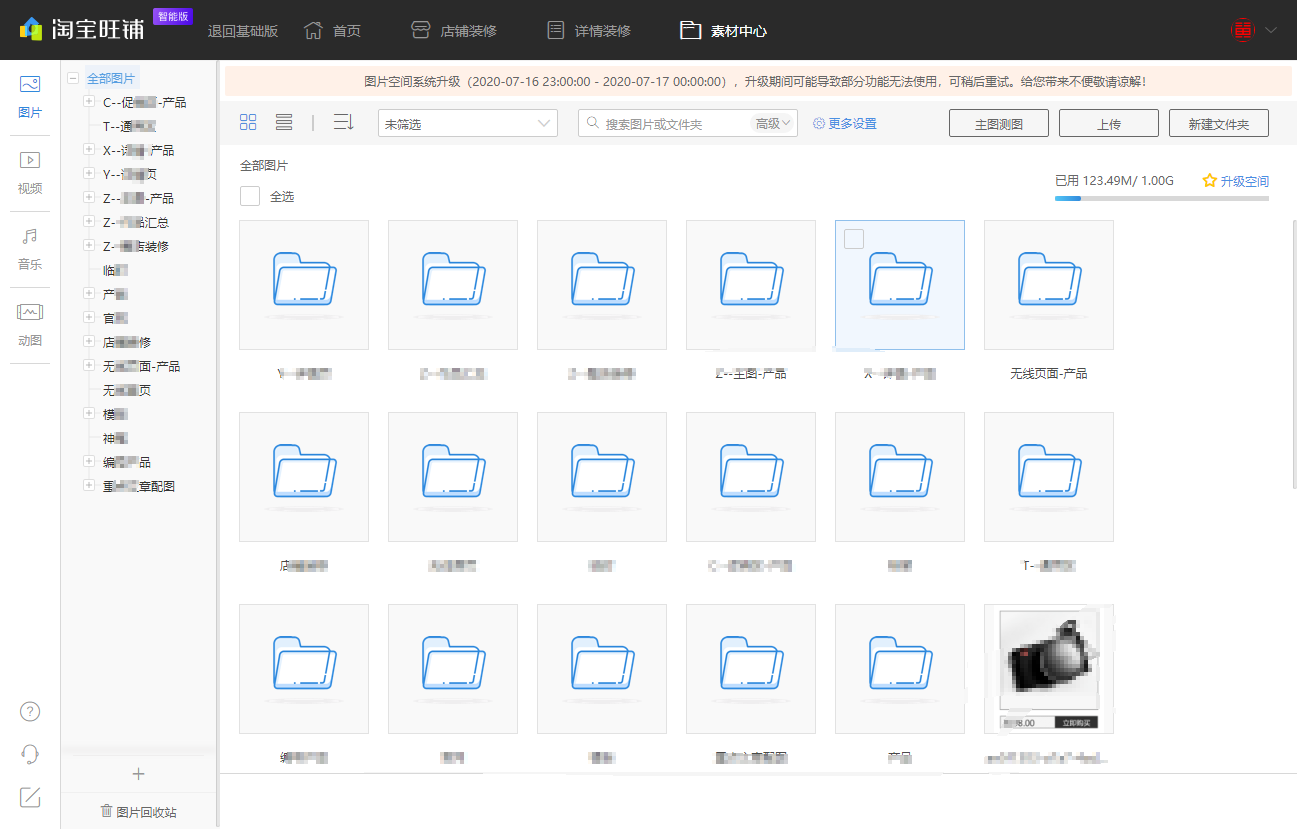 素材中心就是之前的淘宝图片空间,在千牛的卖家中心,也有图片空间的入口,点进去就直接进到了素材中心,店铺的各种图片、视频都放在这个里面